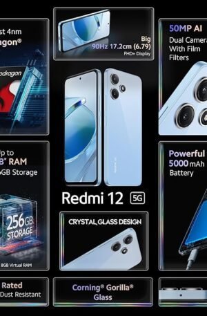 DescriptionRedmi 12 5G mobile comes with a 90 Hz refresh rate 6.79-inch touchscreen display offering a resolution of 2460×1080 pixels (FHD+). The display sports Gorilla Glass for protection. Redmi 12 5G is powered by an octa-core Qualcomm Snapdragon 4 Gen 2 processor. It comes with 8GB RAM. The Redmi 12 5G runs Android 13 and is powered by a 5000mAh non-removable battery. The Redmi 12 5G supports proprietary fast charging.
